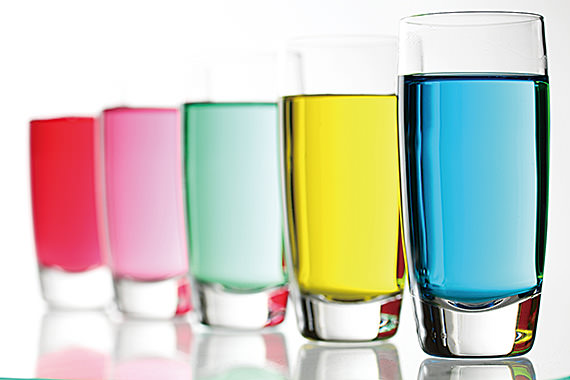 Tôi đặt vài cái ly kế bên nhau, mỗi cái rót chất lỏng có màu khác nhau. Màu sắc sẽ nhạt khi không chớp đèn flash. Để nhấn mạnh màu sắc sống động, tôi phản xạ đèn flash từ bức tường đằng sau những chiếc ly để ánh sáng đi xuyên qua chúng.