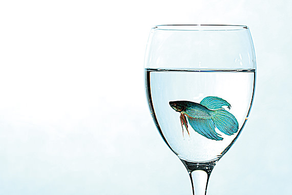 Có thể khó tái tạo màu sắc dễ chịu, sống động của cá, trái cây hoặc thức uống trong một cái chai thủy tinh hơn dự kiến. Trong ví dụ này, tôi sử dụng hai đèn flash Speedlite. Một trong hai đèn được hướng về phía tường ở phía sau và nháy để làm sáng nền sau, và ánh sáng đèn flash phản xạ được khuếch tán xuyên qua kính để làm nổi bật tính chiều hướng và cảm giác trong như pha lê của nền sau sáng và nước bên trong kính. Ngoài ra, tôi nhắm đèn flash thứ hai từ phía trước về phía đối tượng bên trong kính. Làm như thế, không chỉ có thể làm sáng màu sắc, mà còn giúp tránh làm cho đối tượng bị tối do ngược sáng. Điều chỉnh góc đèn flash để tránh phản xạ ánh sáng đèn flash từ phía trước trong kính.