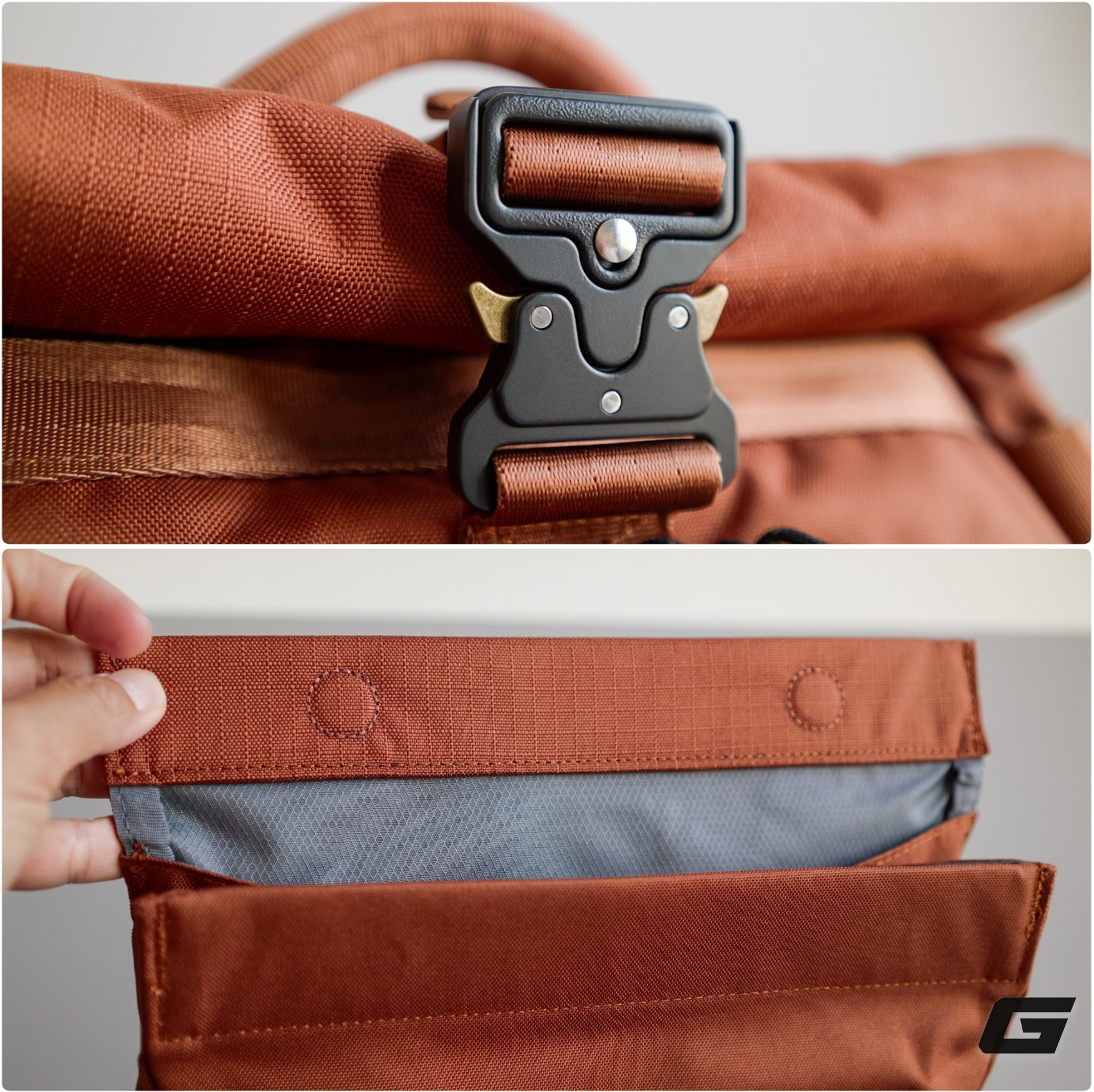 Ở phía trên, phần miệng cuộn có khoá kim loại chắc chắn, bên trong gia cố bằng các dải nam châm giúp đóng mở nhanh.
