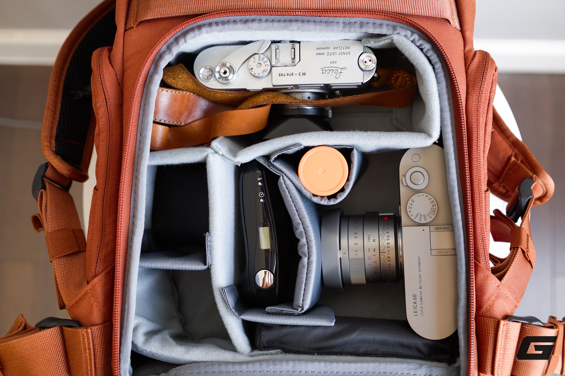 Khi thử sắp xếp với hai thân máy Leica (lắp ống kính 28mm và 35mm) cùng cả Olympus Mju 1, không gian bên trong vẫn gọn gàng, ngăn nắp và thậm chí vẫn còn dư chỗ.