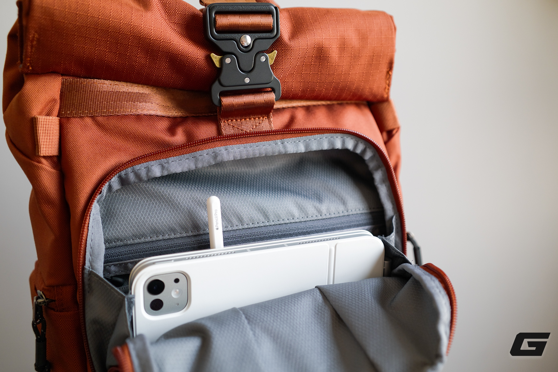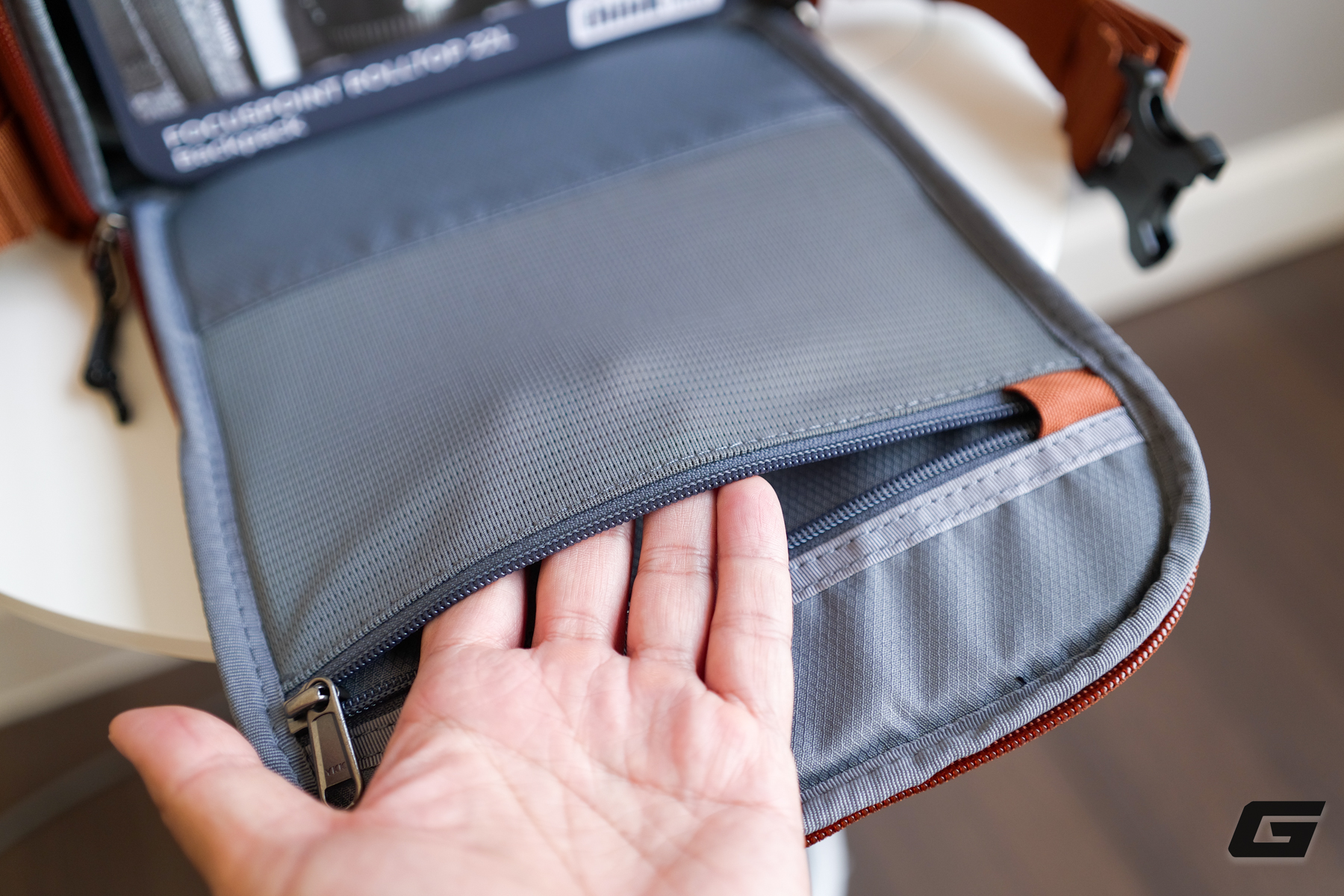 Nhà sản xuất cũng bổ sung hơn mười túi và khe cắm lưu trữ nhỏ rải rác khắp balo. Bên trong mặt lưng và cửa hông bên trái là các ngăn mỏng, phù hợp để cất kính lọc, cáp sạc, pin dự phòng, hay AirTag.