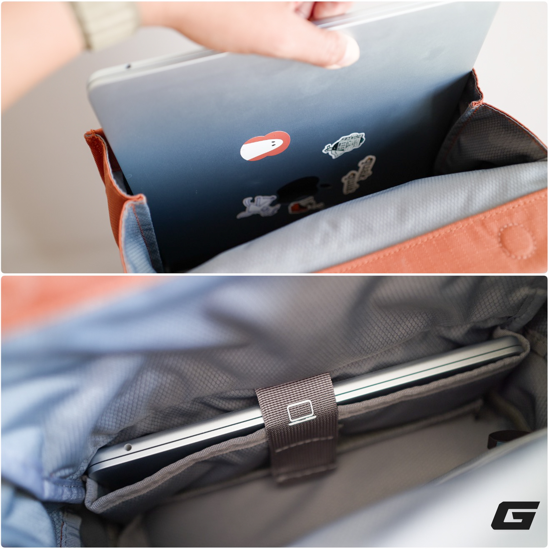 Phía trên khoang thiết bị là khu vực mở ra bằng nắp cuộn, dành cho các vật dụng hàng ngày. Tại đây, thiết kế đã tích hợp sẵn một ngăn chống sốc chuyên dụng vừa vặn cho các dòng laptop 14 inch phổ biến hiện nay (phiên bản 30L có thể chứa laptop 16 inch).