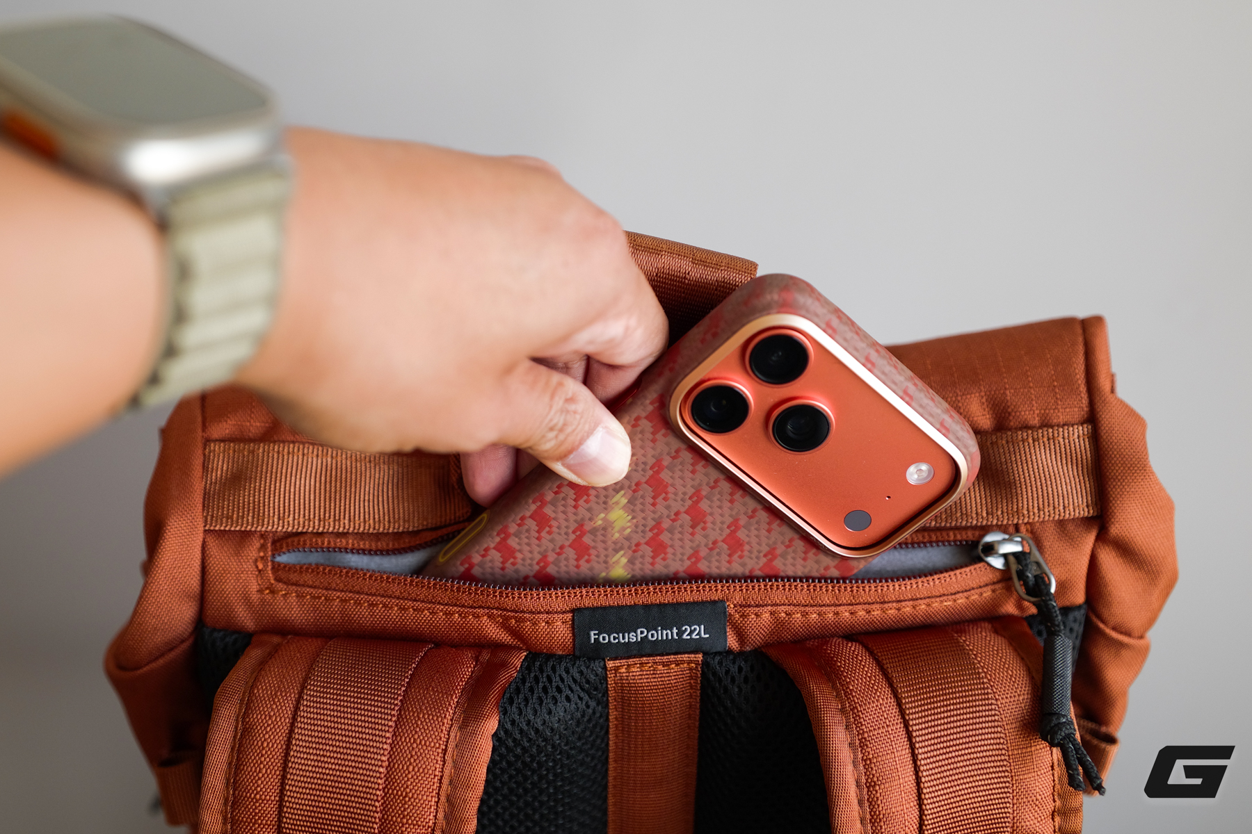 Ngoài ra, FocusPoint còn có một túi khóa kéo kín đáo ở phần trên cùng, nơi bạn có thể đặt điện thoại vào để bảo vệ an toàn và nhanh chóng sử dụng.